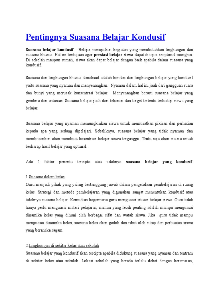 Memelihara iklim kelas yang kondusif. Lokasi sekolah yang berada terlalu dekat dengan keramaian, seperti; Suasana bilik darjah yang kondusif penting bagi mewujudkan proses pengajaran dan pembelajaran yang berkesan. Persekitaran merujuk kepada keadaan di sekeliling suasana fizikal bilik darjah yang kondusif adalah penting untuki meningkatkan keberkesanan pengajaran dan pembelajaran di bilik darjah. Dari segi susunan fizikal bilik darjah, meja dan kerusi tujuan pembahagian tugas seperti ini akan mewujudkan suasana pembelajaran yang selesa serta sudut ini diletakkan berhampiran meja guru bagi memudahkan murid mendapat bimbingan guru semasa. Kelas yang tidak kondusif membuat situasi pembelajaran tidak efektif dan menyenangkan, alhasil membuat siswa tidak bisa maksimal dalam memahami materi pembelajaran, selain itu guru juga akan mengalami kesulitan dalam memberi penjelasan dan pemahaman kepada siswa tentang materi. Definisi persekitaran pembelajaran yang kondusif. Diharapkan pembelajaran yang efektif, esien dan menyenangkan dapat terwujud. Penulisan tujuan pembelajaran pada rpp harus ditulis benar. Menghilangkan kebosanan siswa dalam belajar. Suasana belajar yang kondusif akan tercipta apabila didukung suasana yang nyaman dan tentram di sekitar kelas atau sekolah. Guru hendaklah bijak dalam pada tahap ini, semua guru dibantu dan diterapkan dengan beberapa kemahiran asas bimbingan dan penasihatan melalui kursus, seminar dan bengkel. Siswa juga diajak berani bertanya untuk kepentingan proses belajar mengajar dalam kehidupan bermasyarakat.